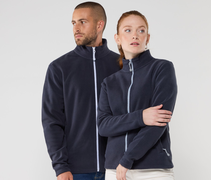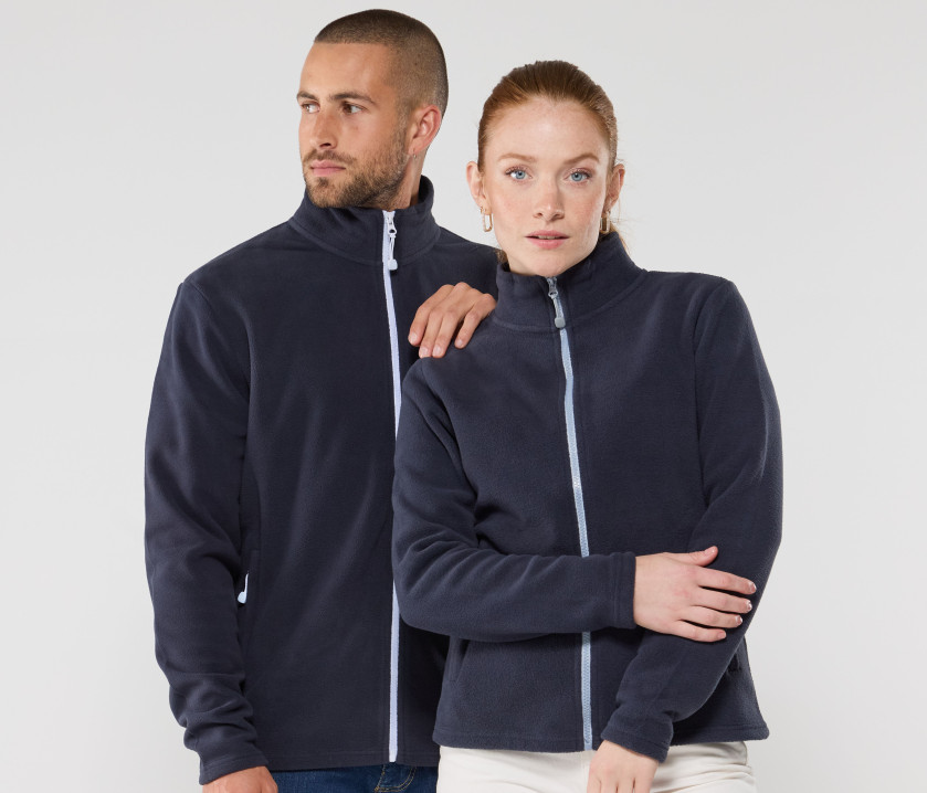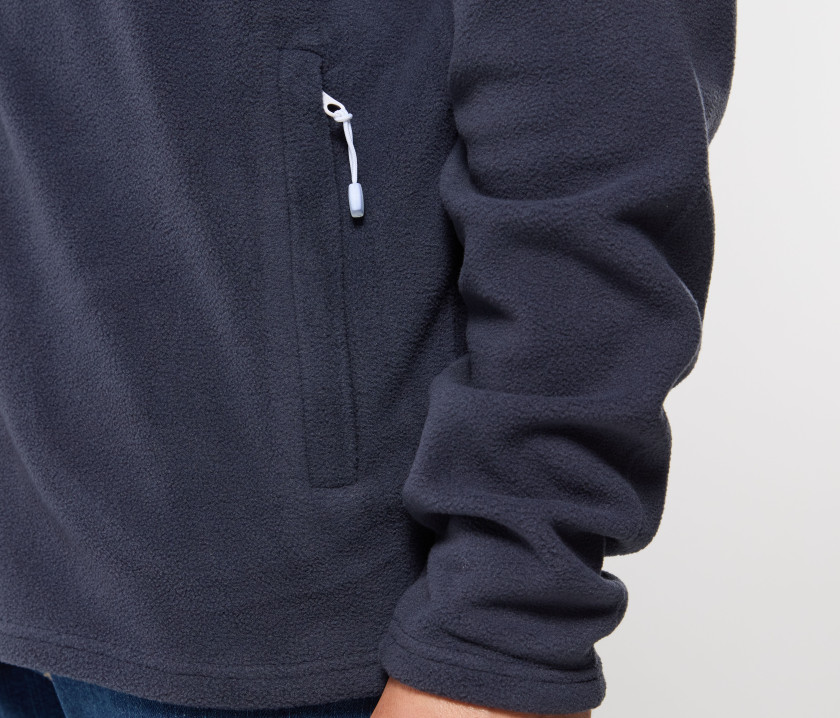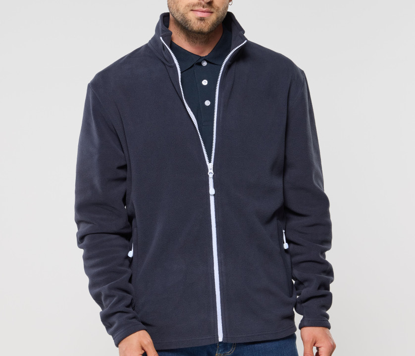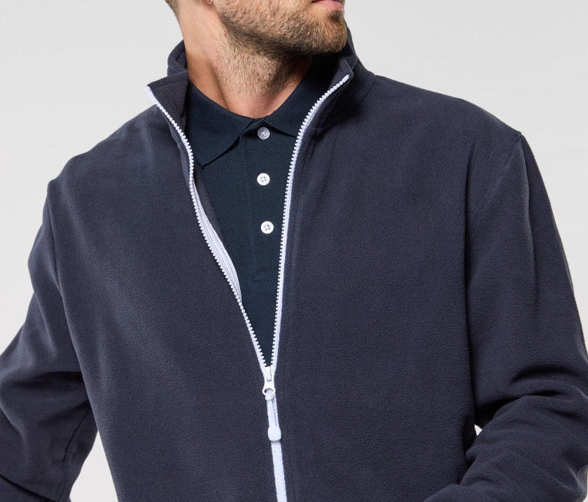 Veste polaire moderne grand zip. 2 poches zippées sur les côtés. Zip principal et zips poches contrastés.