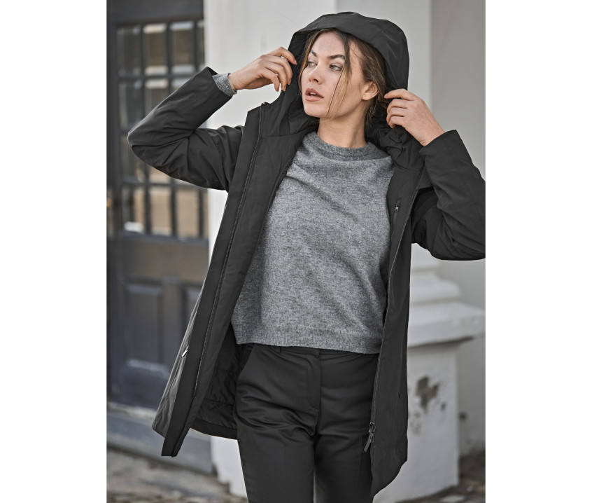 - Parka féminine mi-longue. Fermeture grand-zip. Moderne et sportive. Déperlante. Capuche. Poches avant matelassées et fermetures Éclair® déperlantes. Rabat tempête avec fermetures magnétiques. Produit en transition vers du polyester recyclé. Respirabilité : 3000gr.