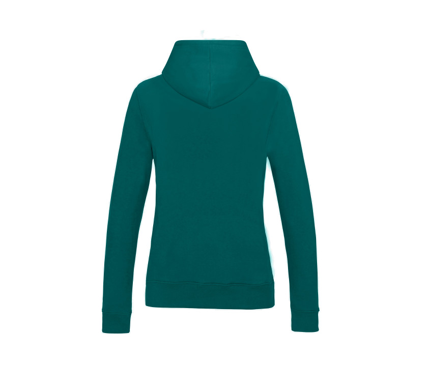 Sweat à capuche femme. Coupe féminine. Double coutures. Capuche doublée. Cordons ton sur ton. Poche kangourou. Taille et poignets en bords côte. Intérieur brossé. Étiquette détachable.