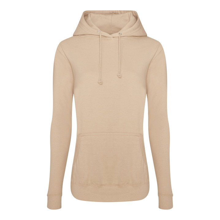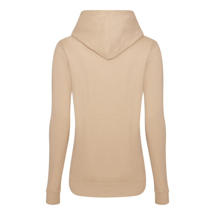 Sweat à capuche femme. Coupe féminine. Double coutures. Capuche doublée. Cordons ton sur ton. Poche kangourou. Taille et poignets en bords côte. Intérieur brossé. Étiquette détachable.