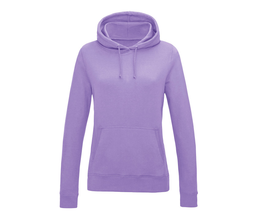 Sweat à capuche femme. Coupe féminine. Double coutures. Capuche doublée. Cordons ton sur ton. Poche kangourou. Taille et poignets en bords côte. Intérieur brossé. Étiquette détachable.