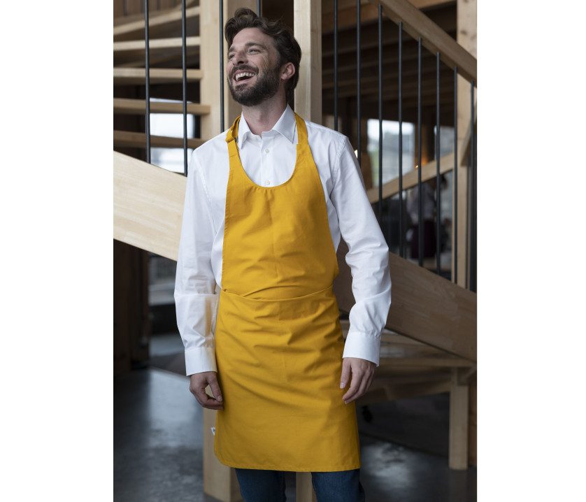 - Tablier sans poche. Hauteur (au col) : 90 cm. Largeur : 75 cm. Boucle plastique pour ajuster l'anse supérieure. Lavage 60°.