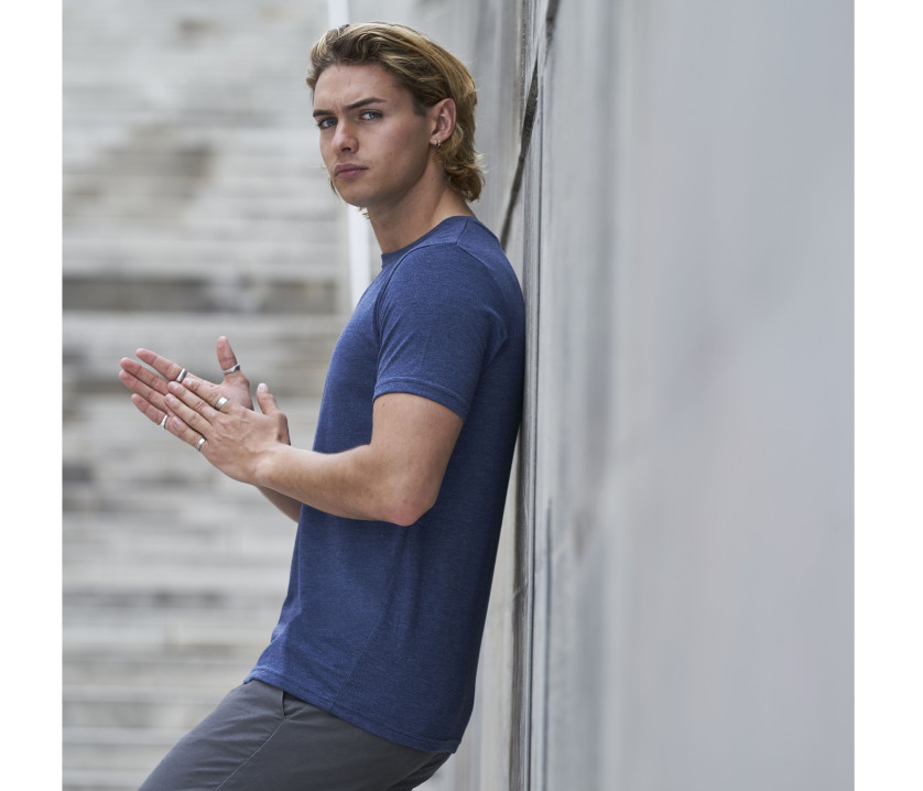 Coupe moderne avec coutures latérales. Étiquette de taille uniquement. Matière Tri-Blend stylée et confortable. Bande de propreté. Col rond à bords côte.