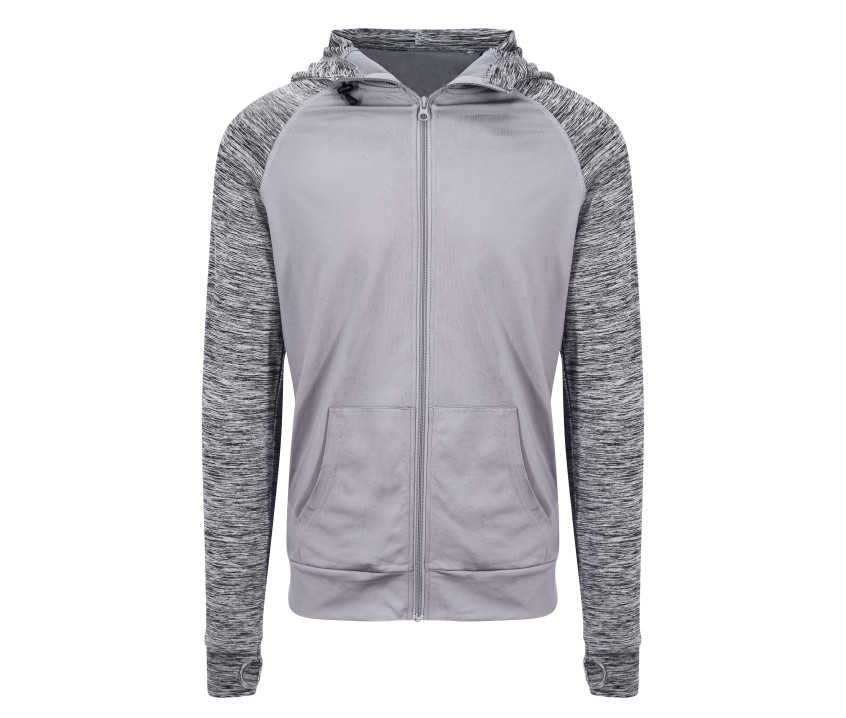 Manches raglan et contrastées. Coupe sportive. Ourlet arrondi dans le dos. Séchage rapide. Capuche ajustable. Poche kangourou. Fermeture grand zip. Trous pour les pouces.