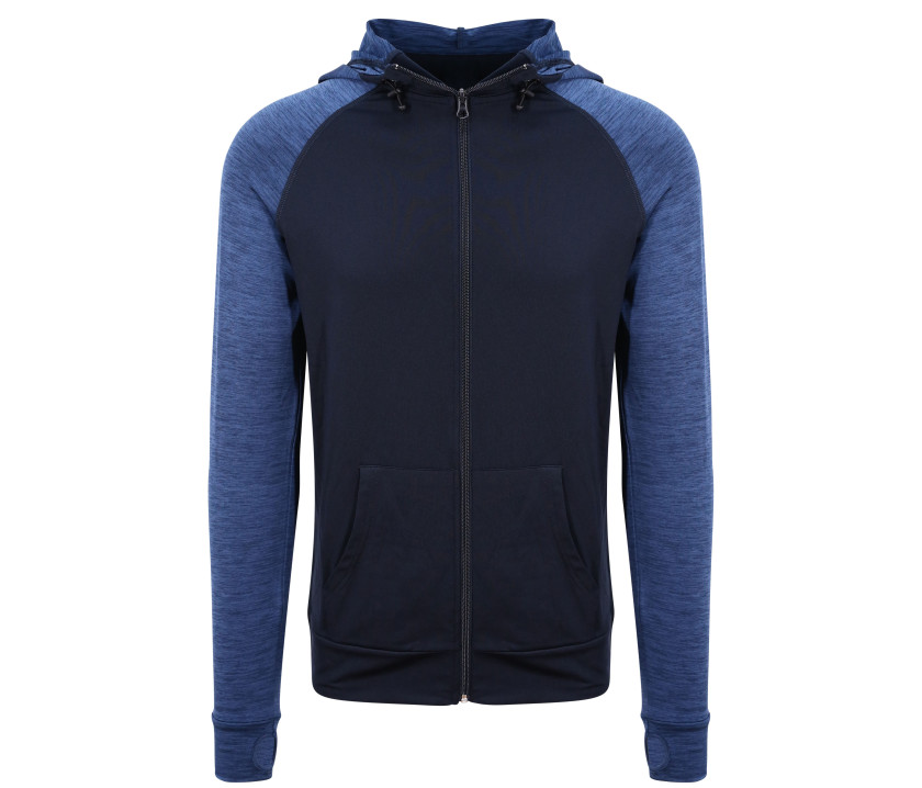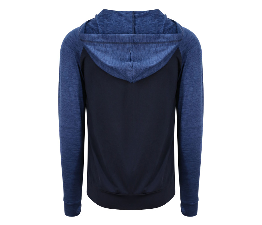 Manches raglan et contrastées. Coupe sportive. Ourlet arrondi dans le dos. Séchage rapide. Capuche ajustable. Poche kangourou. Fermeture grand zip. Trous pour les pouces.