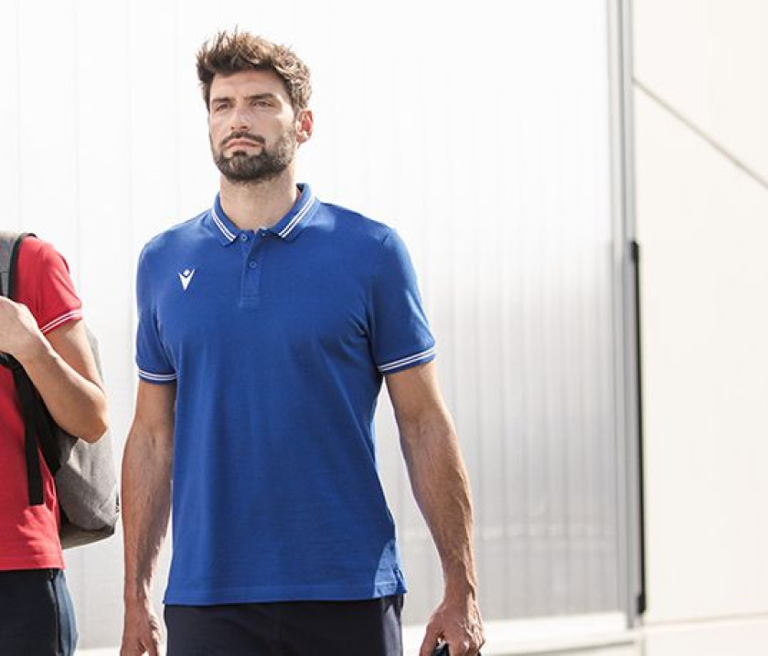 Maille piquée. Coupe à la fois sportive et distinguée. Col avec boutons. Bandes contrastées au col. Bandes contrastées au bas des manches. Coupe slim.