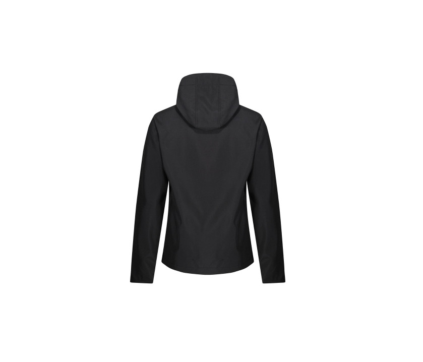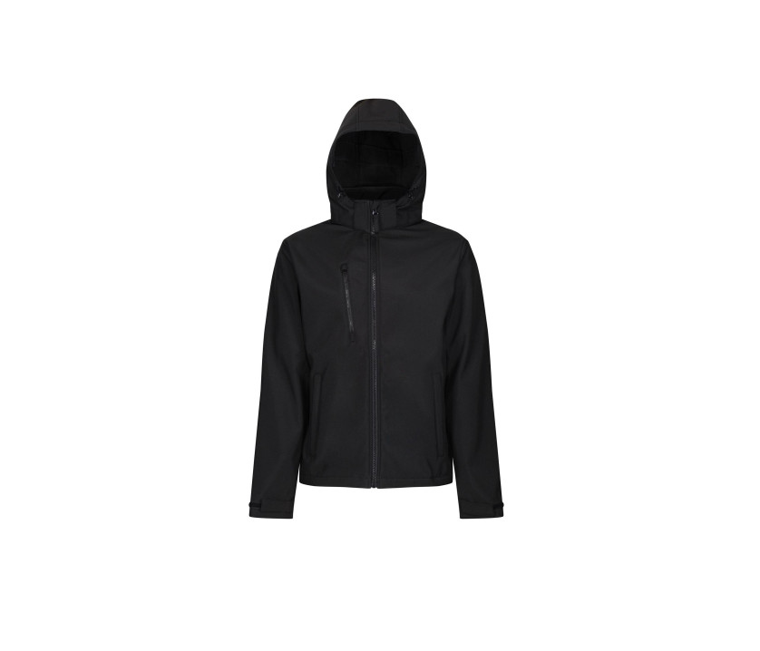 Veste Softshell 3 couches (imperméable, coupe-vent, respirant). Déperlant. Capuche montée avec cordon ajustable (s'attache par zip sur l'arrière et Velcro® sur les côtés). 2 poches avant zippées. Poche poitrine. Poignets ajustables. Convient à la sérigraphie, au transfert et à l'impression vinyle. Imperméable 5000mm et respirant 10000gr.
