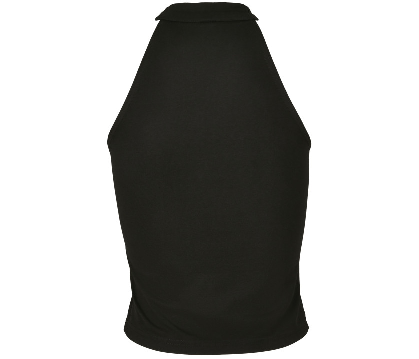 Top au look sportif. Coupe moderne. L'avant et le dos du débardeur sont liés par le col montant. Sans couture aux épaules. Débardeur court.