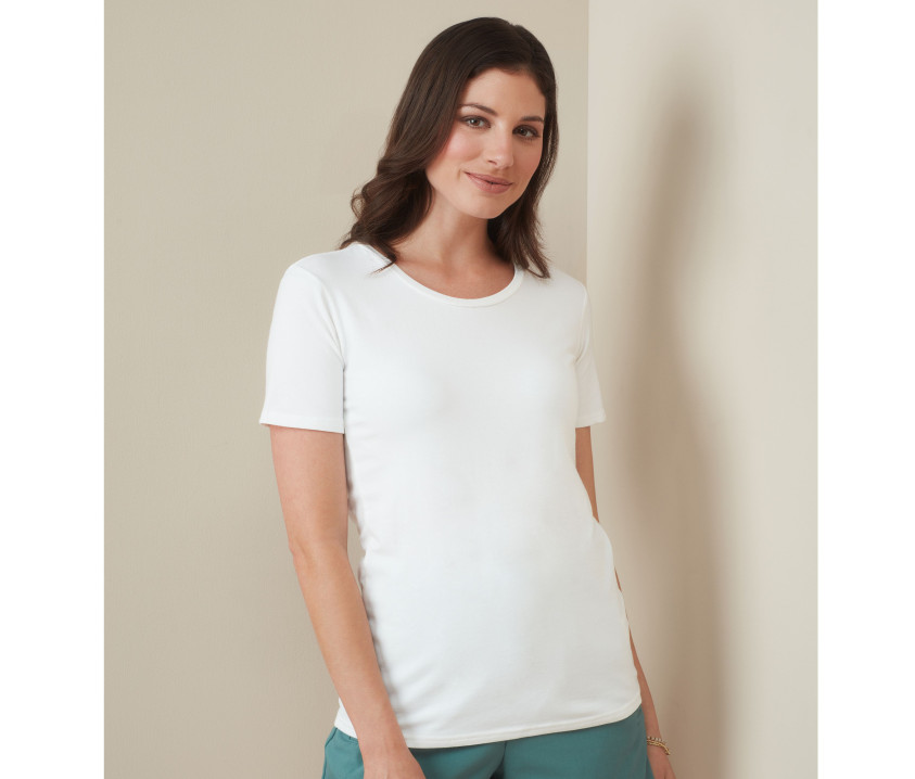 Tee-shirt femme col rond - Coutures aux épaules renforcées. Col fin dans la même matière. Coutures latérales.
