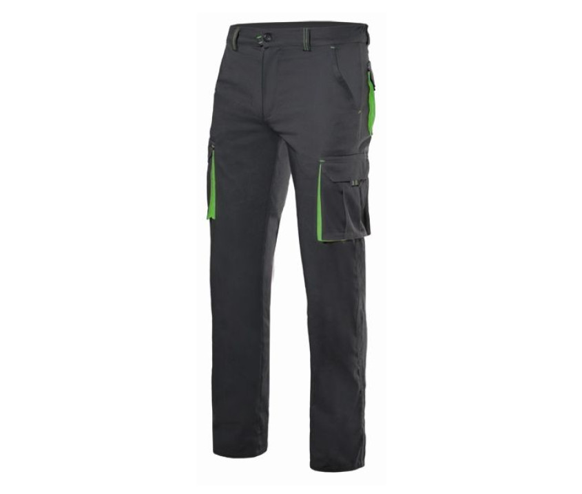Fermeture centrale à glissière et bouton. Contraste de couleurs sur les rabats, les curseurs et les coutures. Taille élastiquée. Double couture de sécurité. Six poches : 2 poches françaises, 2 poches avec fermeture à double rabat central, velcro et curseurs, 2 poches arrières avec fermeture à rabat, velcro et curseurs. EMET, c'est une abréviation pour élasto multi ester, il s’agit d’une matière polyester élastique, moins élastique que l’élasthanne, plus durable et résistante à la javel.