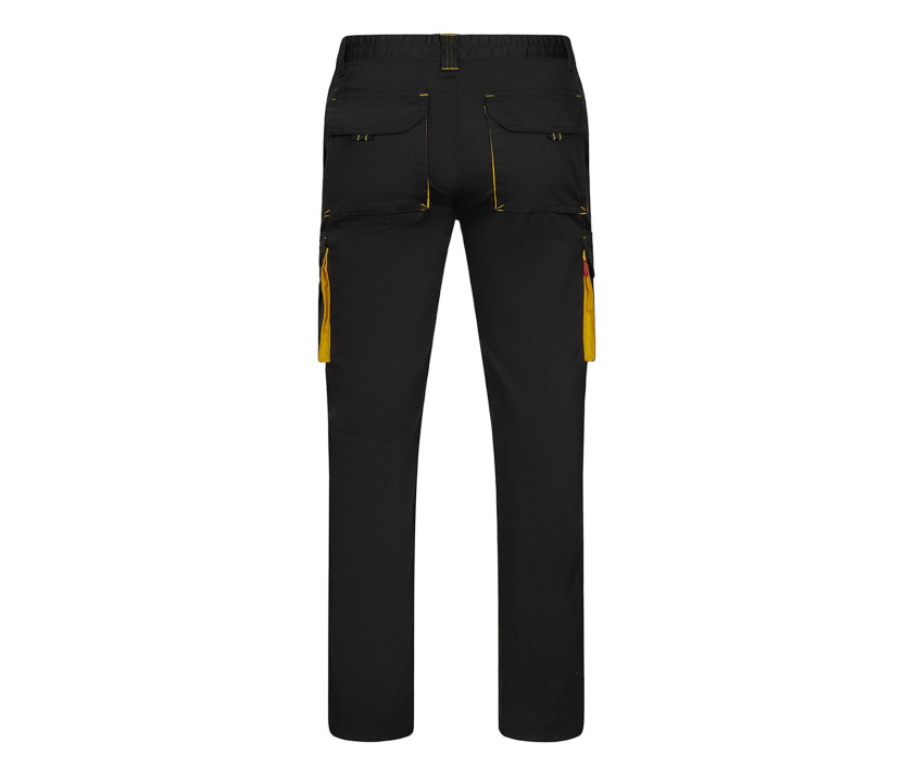 Fermeture centrale à glissière et bouton. Contraste de couleurs sur les rabats, les curseurs et les coutures. Taille élastiquée. Double couture de sécurité. Six poches : 2 poches françaises, 2 poches avec fermeture à double rabat central, velcro et curseurs, 2 poches arrières avec fermeture à rabat, velcro et curseurs. EMET, c'est une abréviation pour élasto multi ester, il s’agit d’une matière polyester élastique, moins élastique que l’élasthanne, plus durable et résistante à la javel.