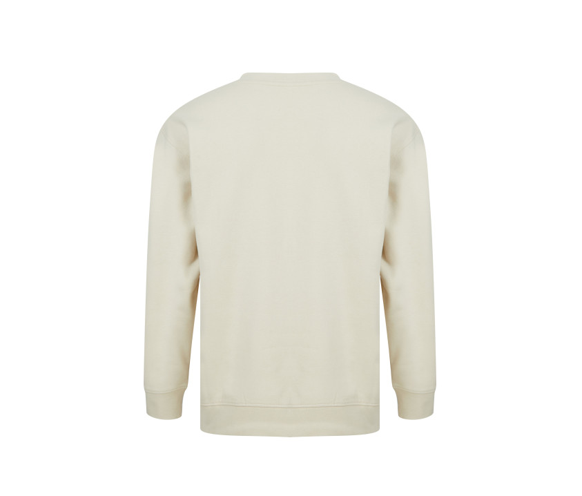 Sweatshirt unisexe à la coupe décontractée. Manches droites. Épaules tombantes. Sweat plus long au dos. Col rond et poignets en bords côte. Surpiqûres ton sur ton. Sans étiquette de marque. Bande de propreté au col.