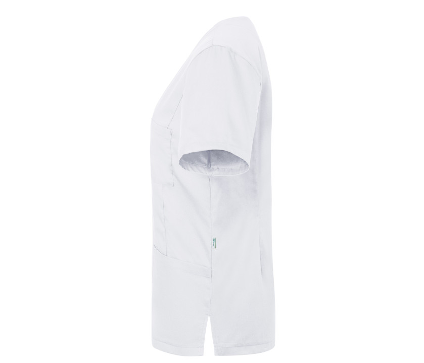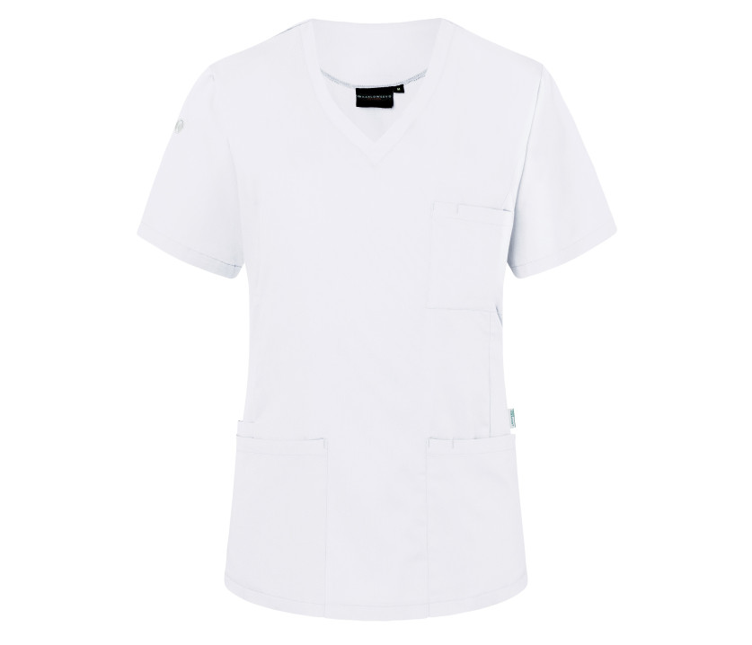 Col V. Convient notamment aux secteurs de la santé et de la beauté. Lavable à 95°. Coupe légèrement ajustée. 2 poches sur les côtés et 1 poche cachée côté droit. Poche poitrine.