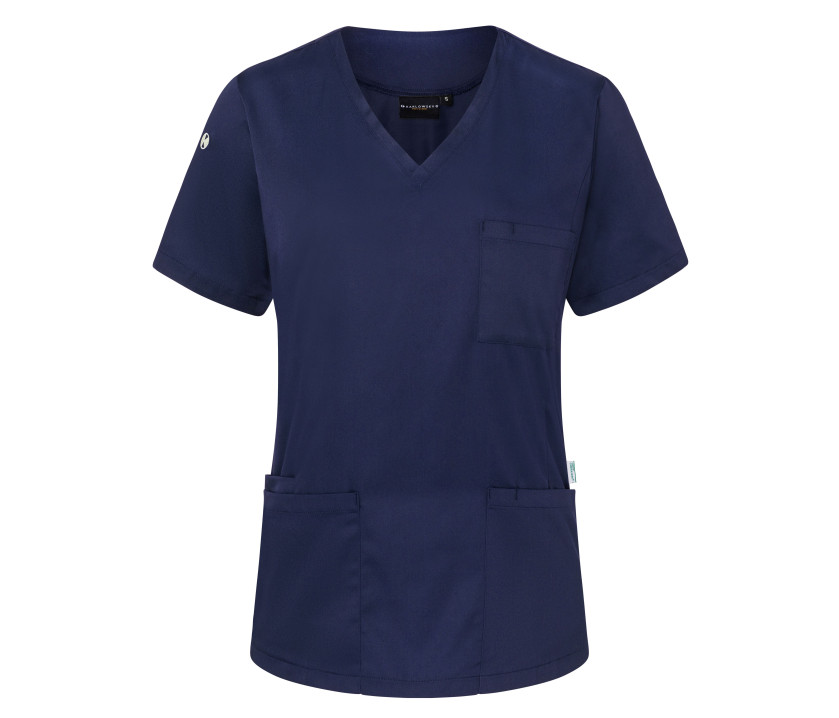 - Col V. Convient notamment aux secteurs de la santé et de la beauté. Coupe légèrement ajustée.