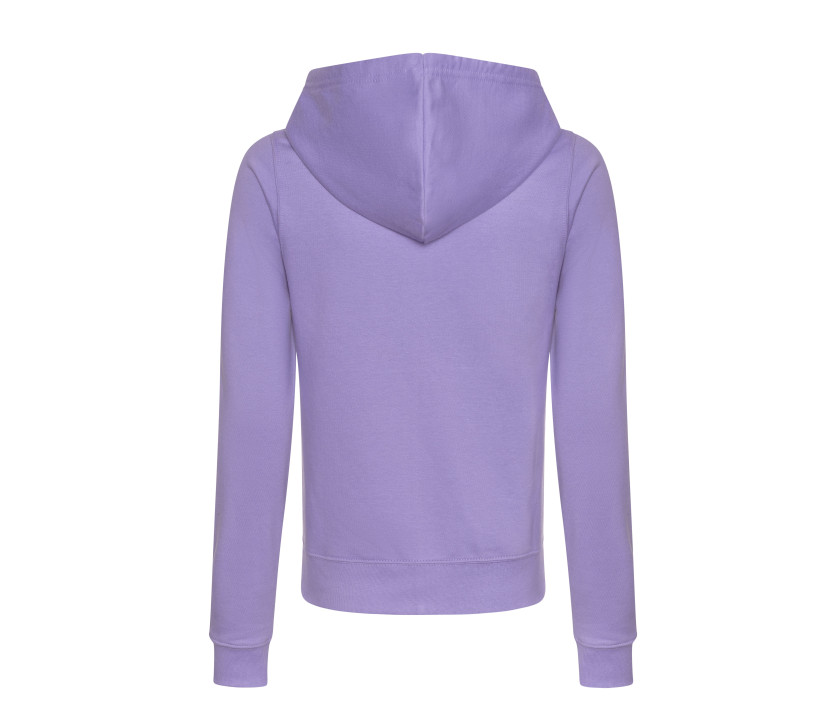 Coupe décontractée pour femme. Fermeture zippée recouverte en plastique YKK. Surpiqûre double aiguille. Capuche doublée. Cordon de serrage ton sur ton. Poche kangourou. Étiquette détachable. Intérieur brossée. Poignets et taille en bord côte. Tissu doux en coton.