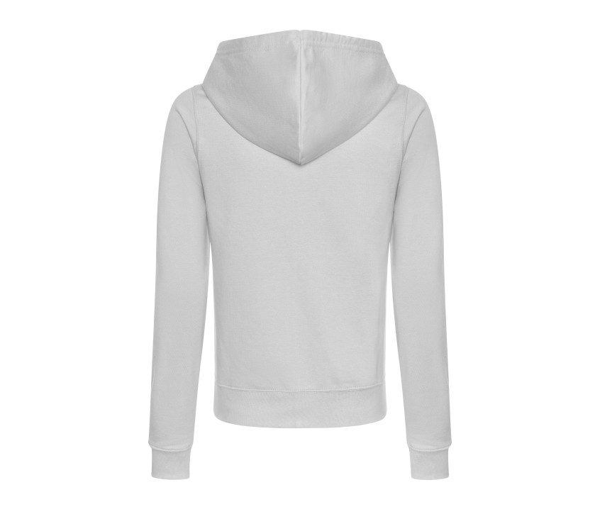 Coupe décontractée pour femme. Fermeture zippée recouverte en plastique YKK. Surpiqûre double aiguille. Capuche doublée. Cordon de serrage ton sur ton. Poche kangourou. Étiquette détachable. Intérieur brossée. Poignets et taille en bord côte. Tissu doux en coton.
