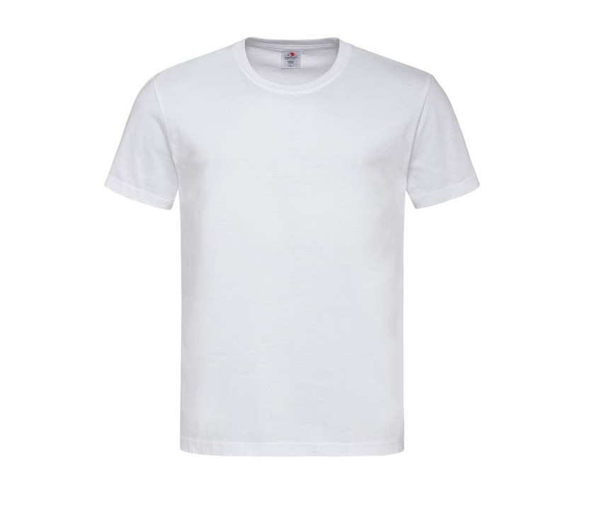 Tee-shirt col rond homme - Coupe tubulaire. Bandes de propreté aux épaules. Étiquette de taille et d'entretien au col.