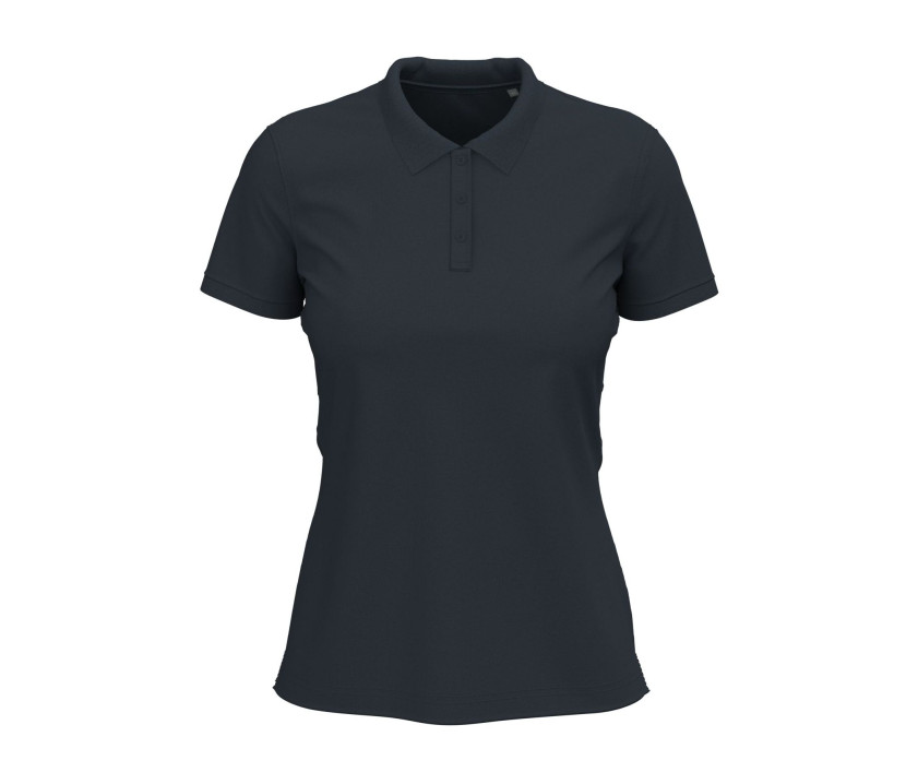 Maille piquée. Matière stretch. Plaquette 3 boutons. Puce de taille au col. Étiquette détachable sur le côté. Col moderne et étroit. Bande de propreté au col. Coupe féminine. Coutures latérales avec fentes. Bord côtes aux manches et au col.