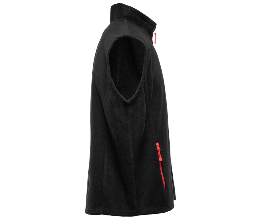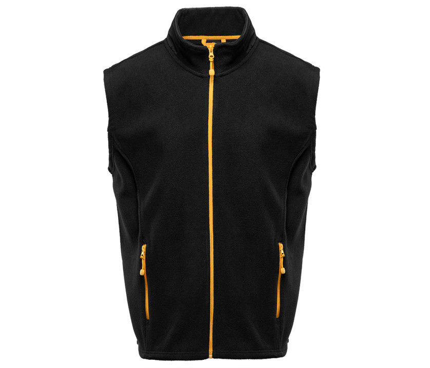 Fermeture zippée contrastée. Bande de propreté en chevron. Poches zippées avec tirette en plastique.