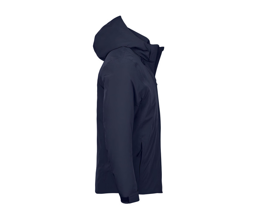 Veste homme imperméable - Matelassage DuPont™. Capuche amovible avec cordons ajustables. Coutures thermocollées. Taille ajustable avec cordons et stoppers. Produit en transition vers du polyester recyclé.