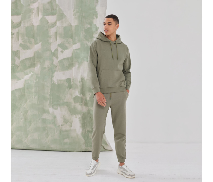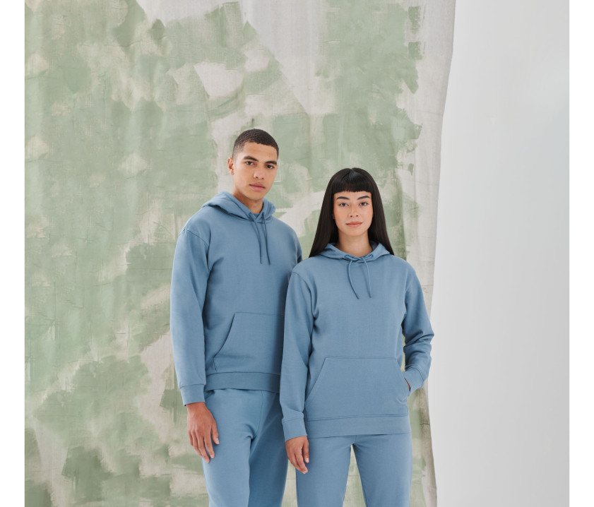 Manches droites. Épaules tombantes. Dos plus long. Taille et poignets en bord côte. Bande de propreté au col. Cordons de serrage ton sur ton. Poche kangourou. Surpiqûres ton sur ton. Intérieur brossé.