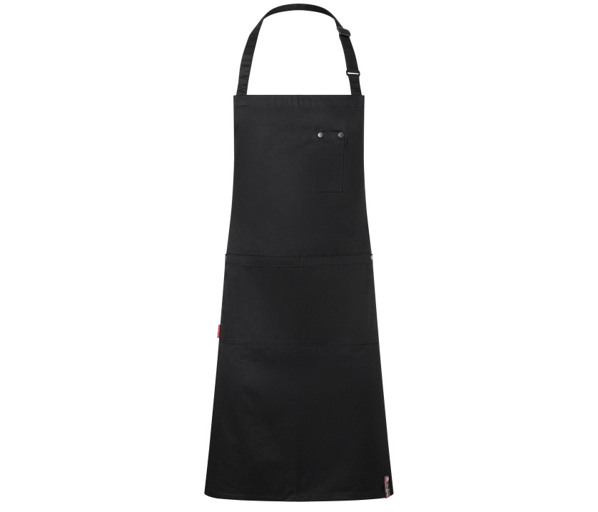 Rivets en relief Rock Chef® sur la poitrine et les poches avant. Sangle réglable avec boucle. 2 grandes poches avant. Poche poitrine élégante. Lavable jusqu'à 60°.