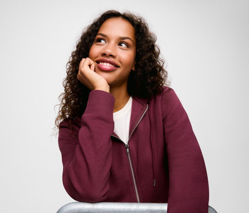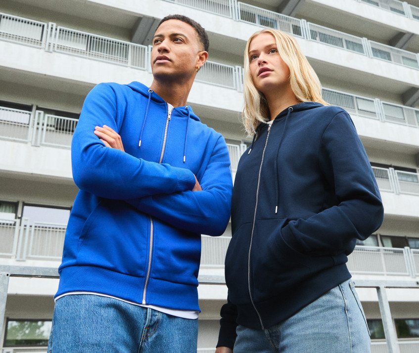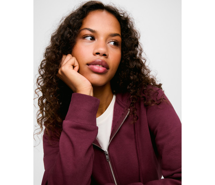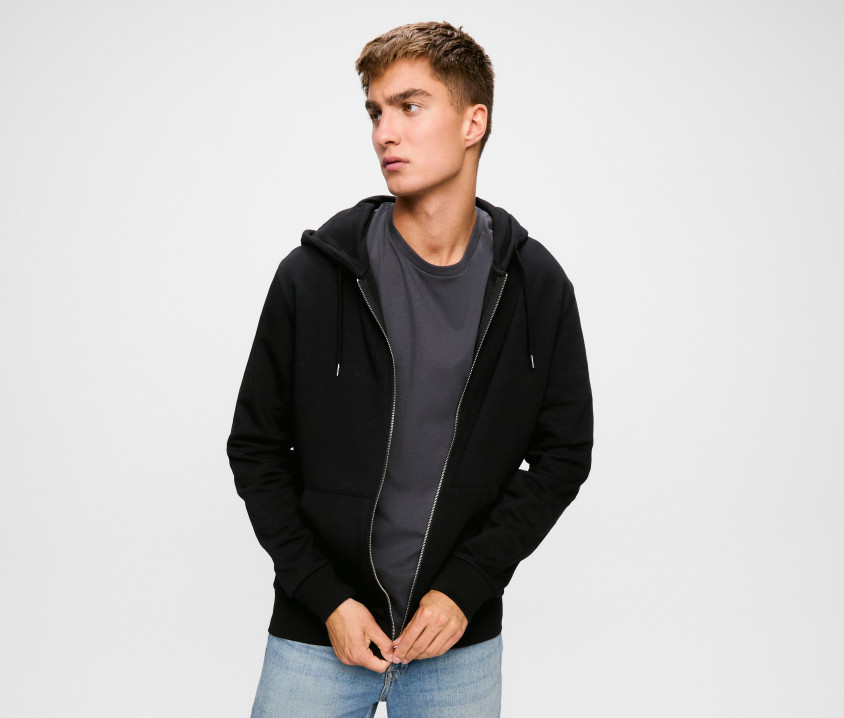 Fermeture zippée métallique. Capuche avec cordon de serrage aux embouts en métal. Poche kangourou.