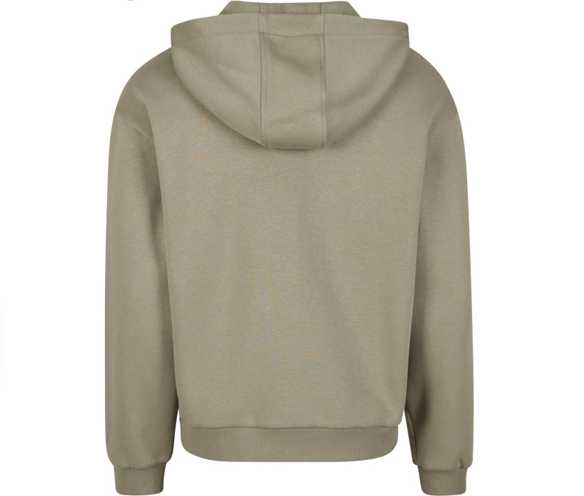 Coupe oversize. Épaules tombantes. Poche kangourou. Rib aux poignets et taille. Fermeture éclair en métal. Intérieur brossé.