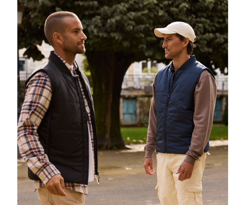 Col en bord côte. 2 poches avec zip caché. 1 poche intérieure zippée. Accès marquage. Ouatine 100% polyester recyclé. Espacement entre les coutures : 14cm.