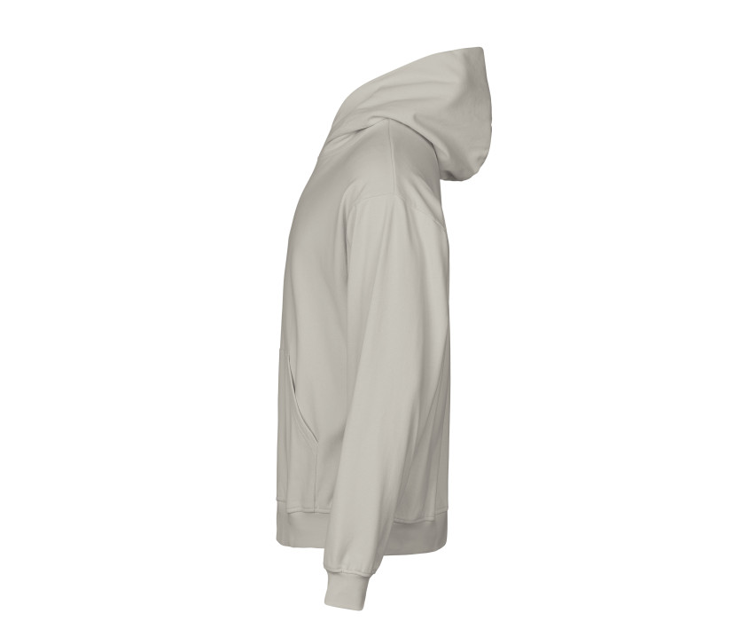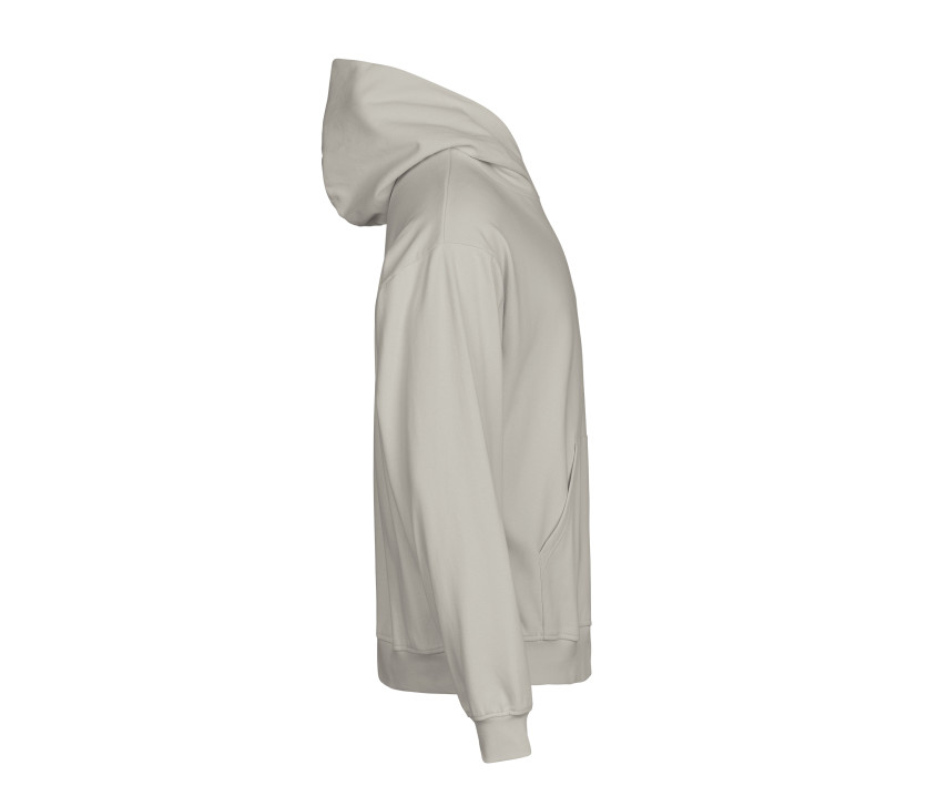 Coupe ample. Épaules tombantes. Rib avec élasthanne. Intérieur brossé. Demi-lune pour marquage personnalisé. Double teinture.