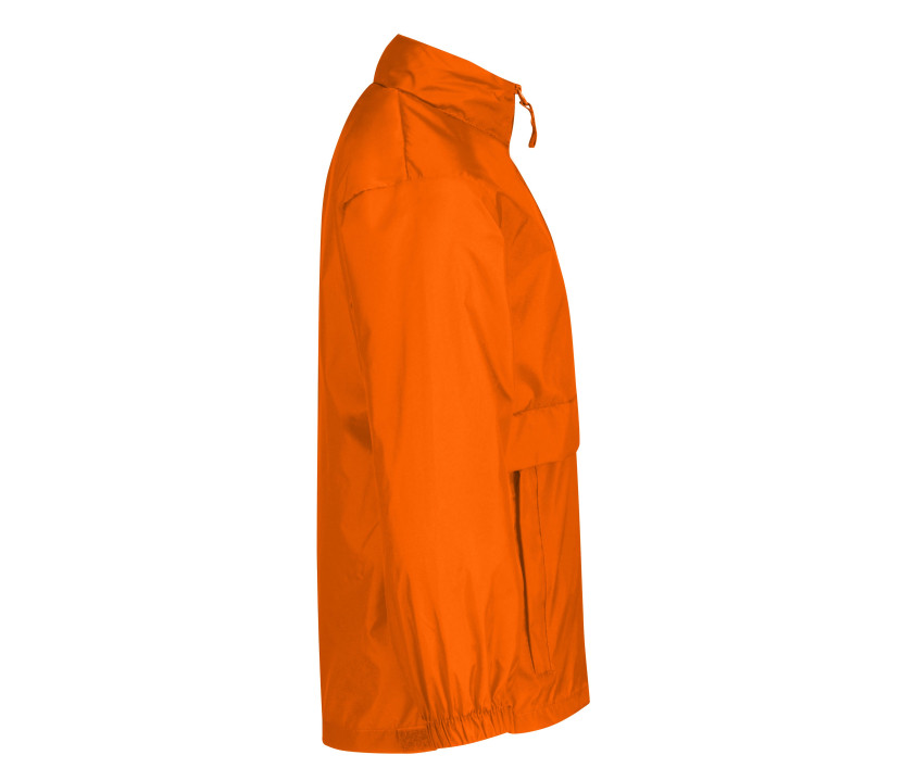 Fermeture zippée. Capuche dans le col. Veste imperméable et coupe-vent, repliable dans une poche centrale.
