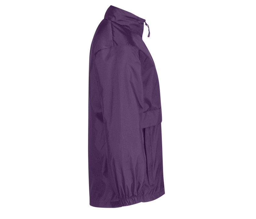 Fermeture zippée. Capuche dans le col. Veste imperméable et coupe-vent, repliable dans une poche centrale.