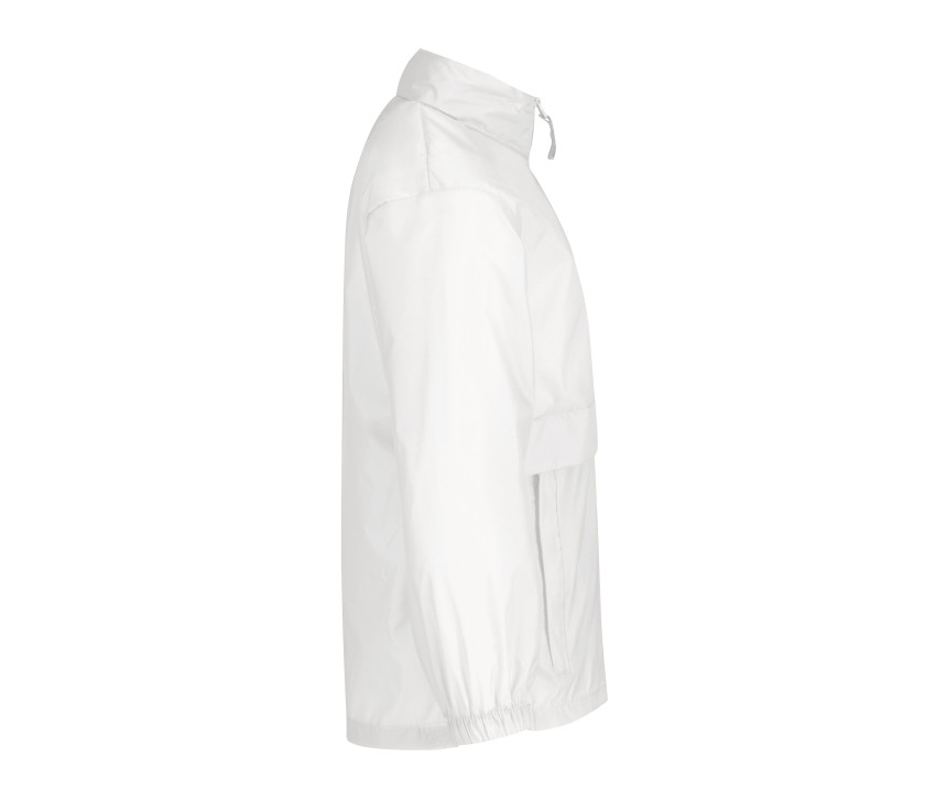 Fermeture zippée. Capuche dans le col. Veste imperméable et coupe-vent, repliable dans une poche centrale.