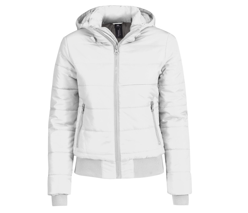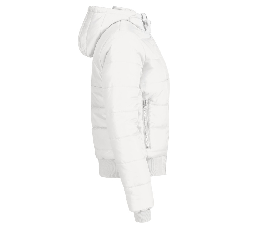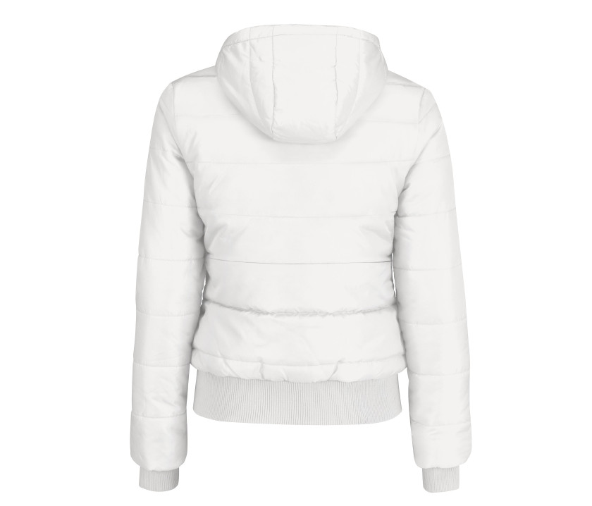 Blouson doudoune capuche femme - Tissu extérieur avec enduit acrylique, résistant aux averses, respirant et coupe-vent. Accès marquage dos et cœur. Capuche rembourrée, détachable et ajustable.