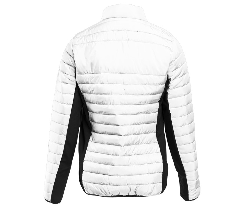 Doudoune légère moderne bi-matière, coupe ajustée. 2 poches latérales zippées. 2 poches intérieures. Protège menton. Zips contrastés. Dimension zone de marquage avant 9cm et 12cm à l’arrière.