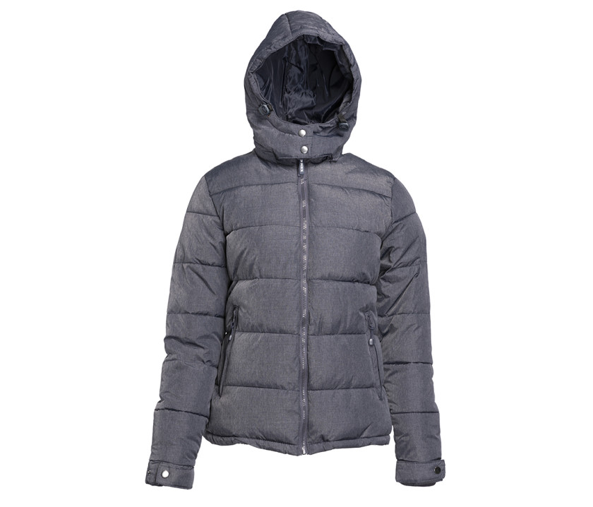 Doudoune femme matelassée avec capuche amovible. 2 poches zippées sur les côtés. 1 poche intérieure zippée. 1 poche intérieure Velcro®. Capuche pré-formée. Tricots aux poignets. Accès marquage au dos.
