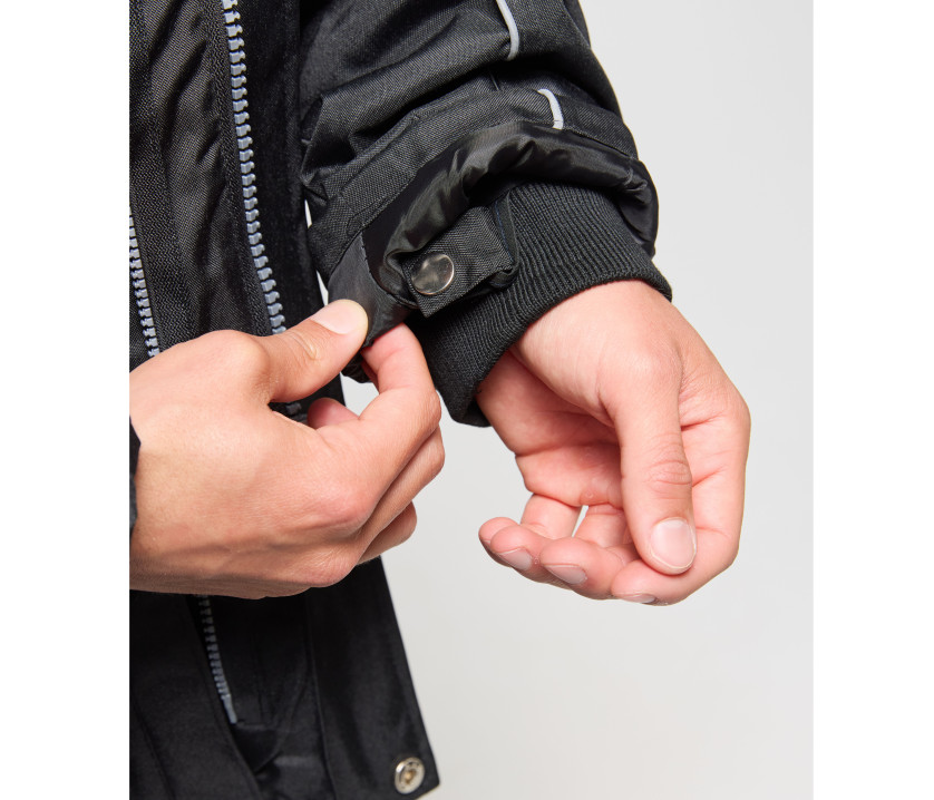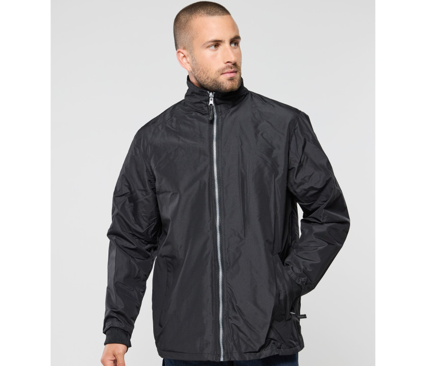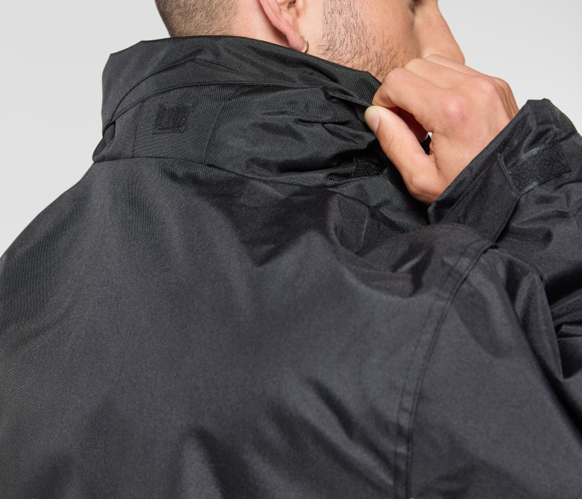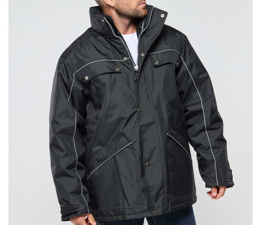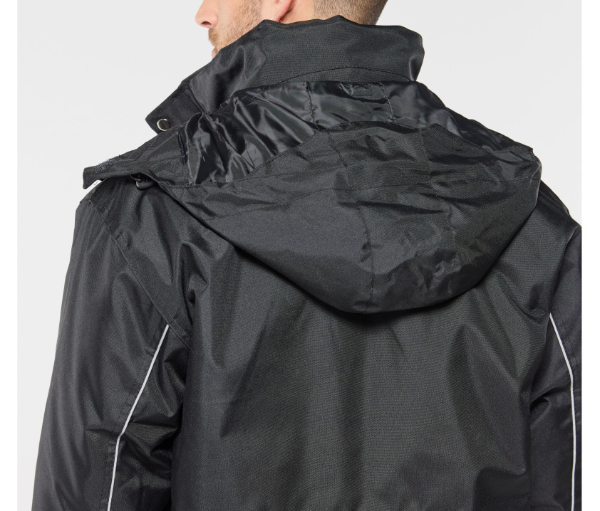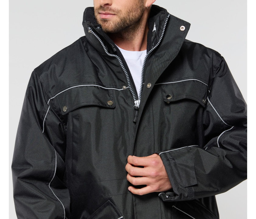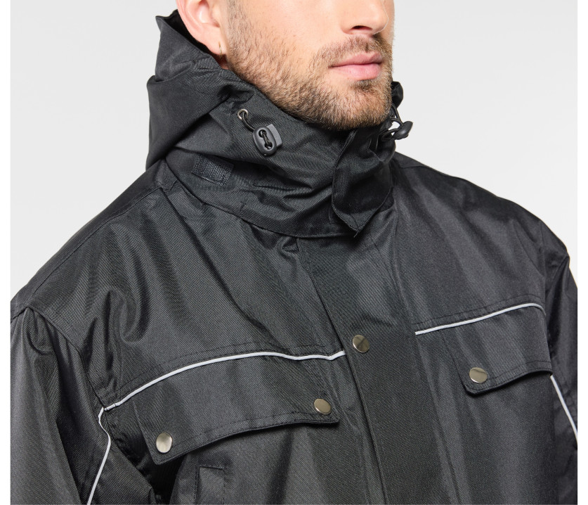 - Veste de travail 3 en 1. Coupe-vent et imperméable. Passepoil réfléchissant sur le devant et le dos des manches. Capuche passe-montagne dans le col.