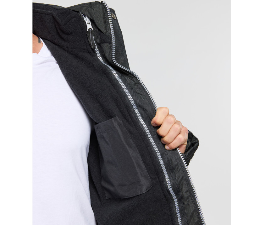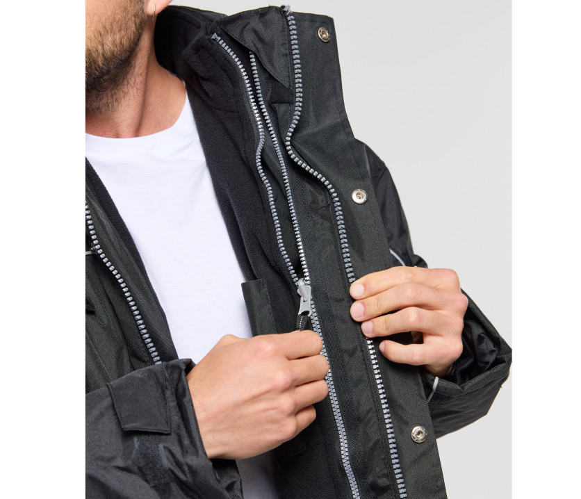 Veste de travail 3 en 1. Coupe-vent et imperméable. Passepoil réfléchissant sur le devant et le dos des manches. Patte auto-agrippante aux manches. Capuche passe-montagne dans le col. Col doublé polaire. 6 poches (4 poches poitrine (dont 2 avec boutons pression), 2 poches extérieures zippées avec tirette). Veste intérieure demi-saison. Bords côte aux manches. 2 poches latérales zippées, 3 poches intérieures dont 1 grande (18x23cm), et 1 poche poitrine intérieure zippée.