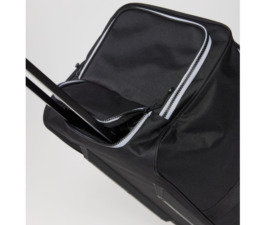 Grand sac de voyage à roulettes. Poignée télescopique. 2 anses. Poche latérale et poche centrale en forme de U. Zips contrastés. Surfaces d'impression avant : 16x12cm et côtés : 16x18cm.