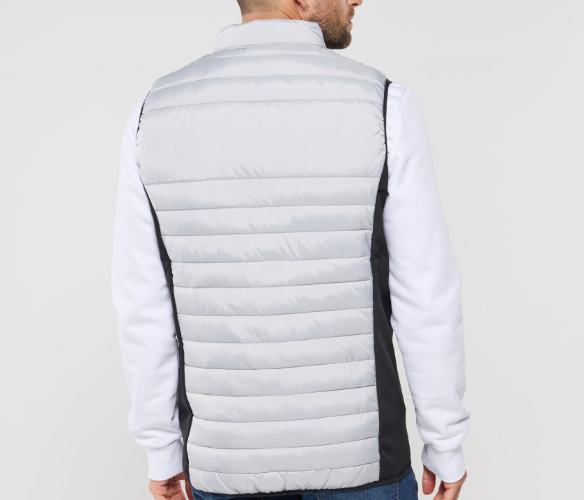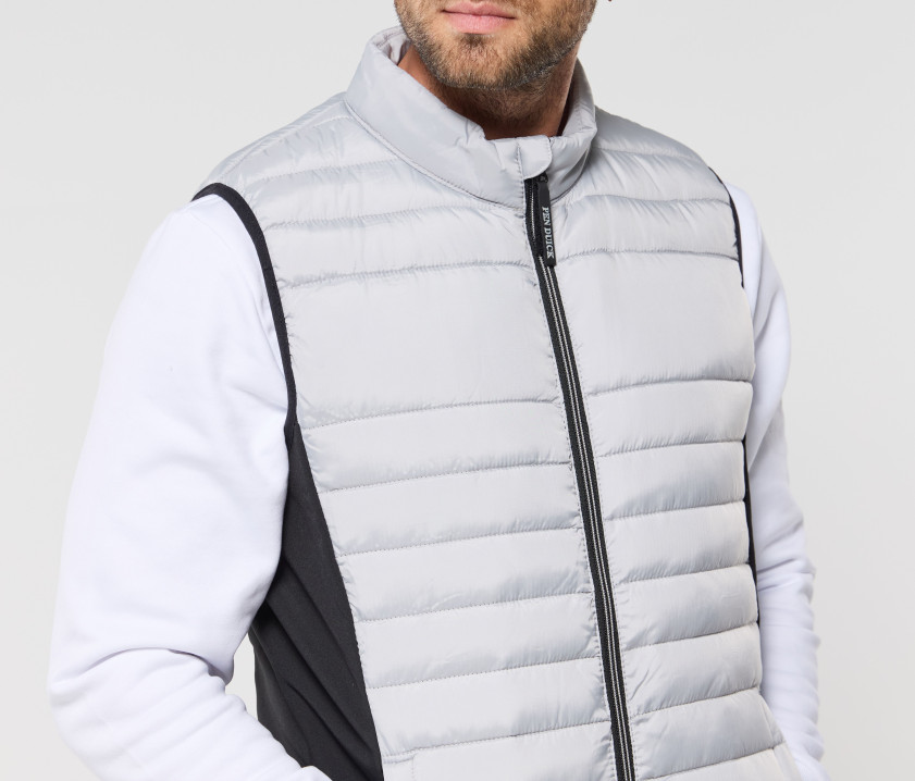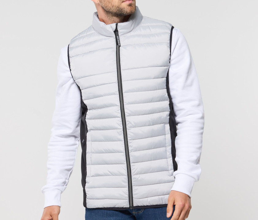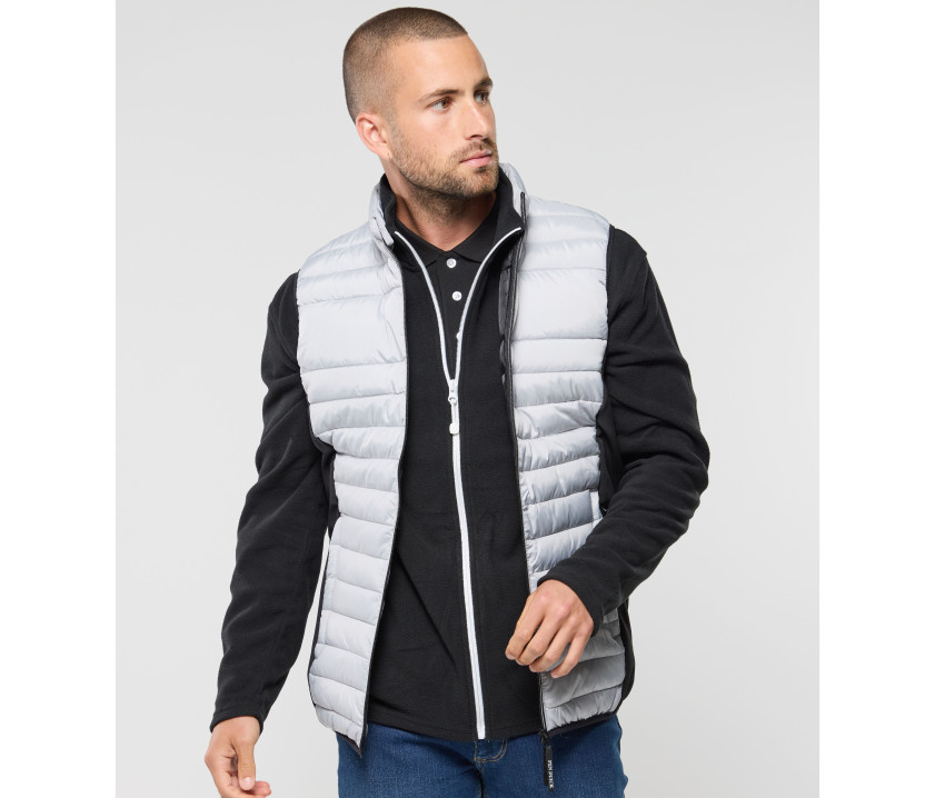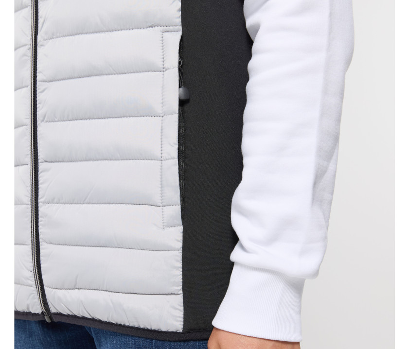 Bodywarmer léger moderne bi-matière. 2 poches latérales zippées. Protège-menton. Zips contrastés. Dimension zone de marquage avant 9cm et 12cm à l’arrière.