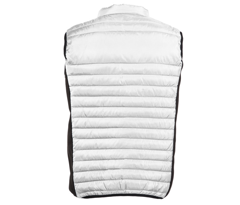 Bodywarmer léger moderne bi-matière. 2 poches latérales zippées. Protège-menton. Zips contrastés. Dimension zone de marquage avant 9cm et 12cm à l’arrière.