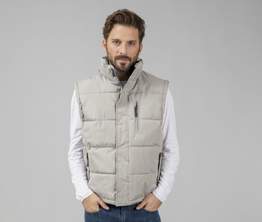 Véritable doudoune sans manches avec enduction Weather Block+®. Épais et chaud. Col en tricot. Capuche dans le col. 2 poches latérales zippées et 1 poche cœur zippée. 1 poche intérieure portefeuille. Poche zippée au bas du dos avec rabat.