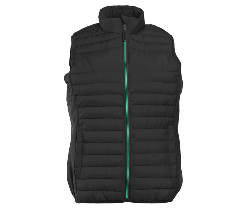 Bodywarmer léger moderne bi-matière. 2 poches latérales zippées. Protège-menton. Zips contrastés. Dimension zone de marquage avant 9cm et 12cm à l’arrière.