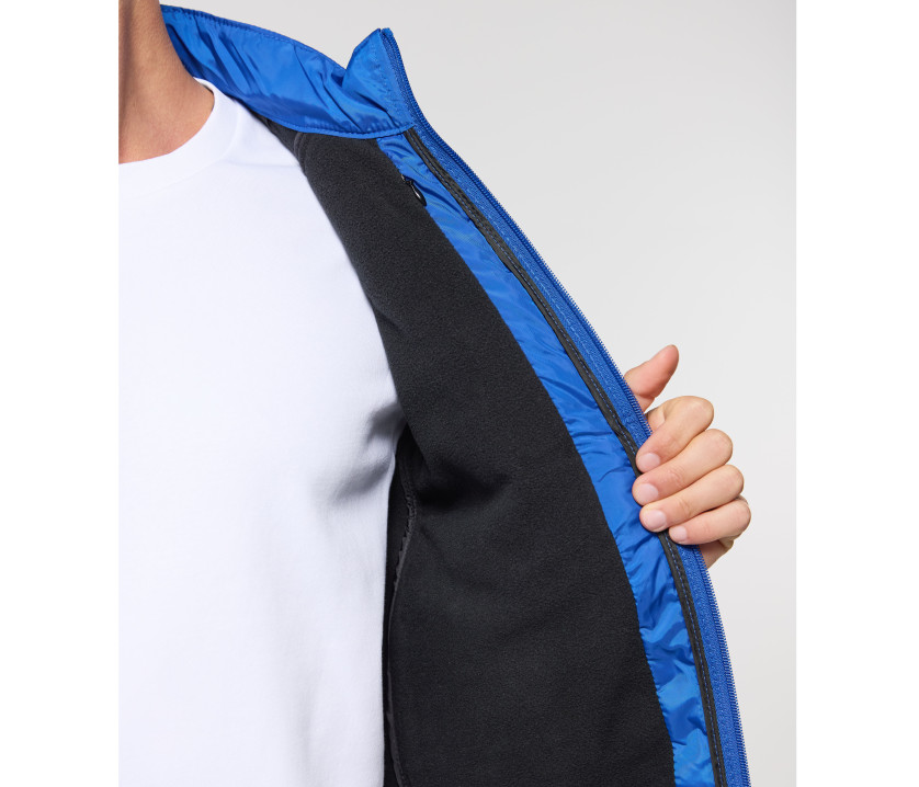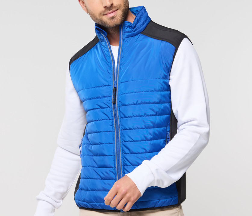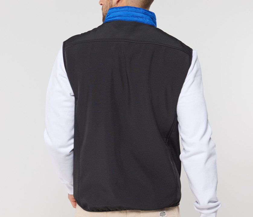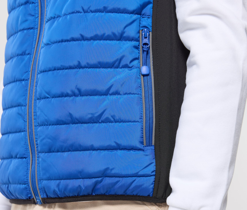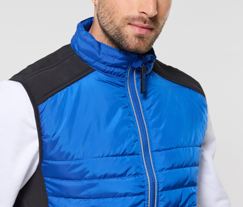 Bodywarmer bi-matière déperlant et coupe-vent. Coupe et look moderne. Accès marquage cœur. 2 poches zippées latérales. Ourlet réfléchissant sur les zips. Dos entièrement noir.