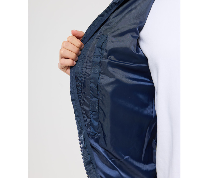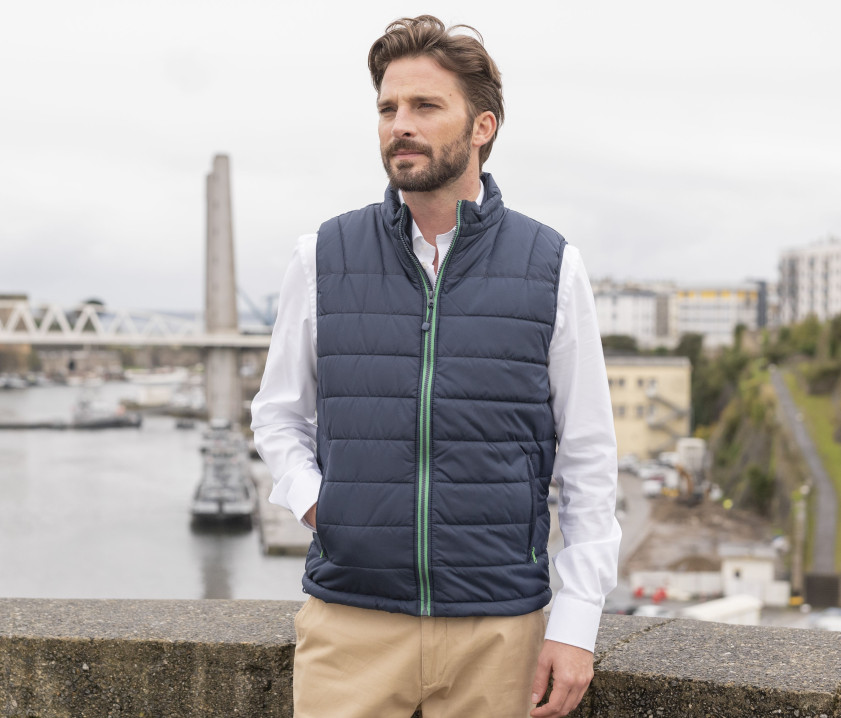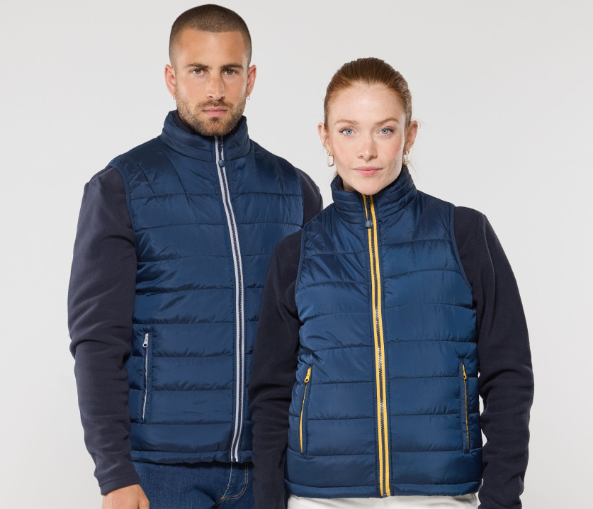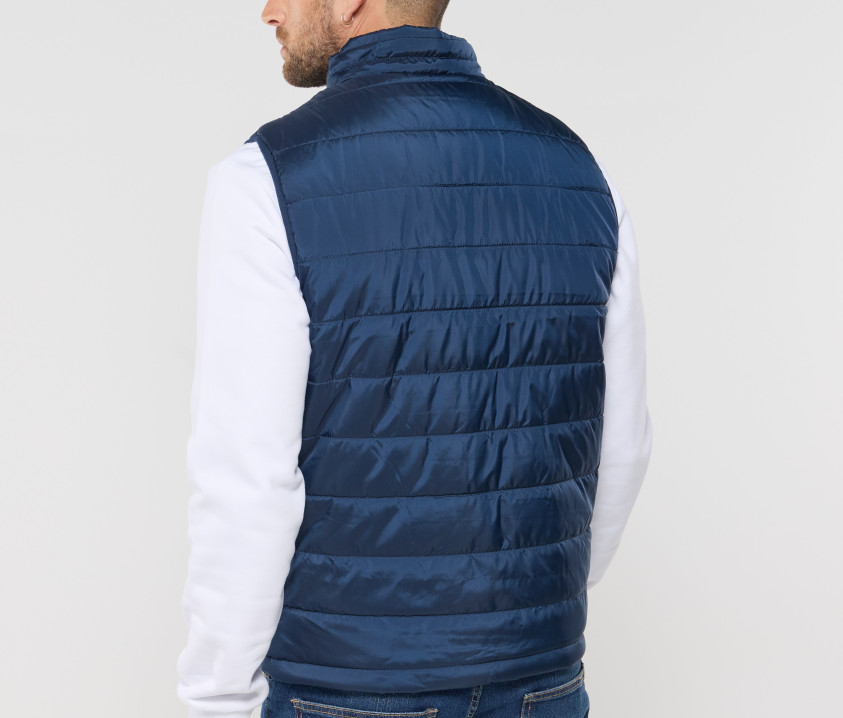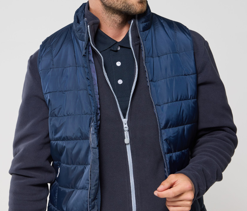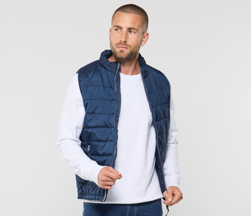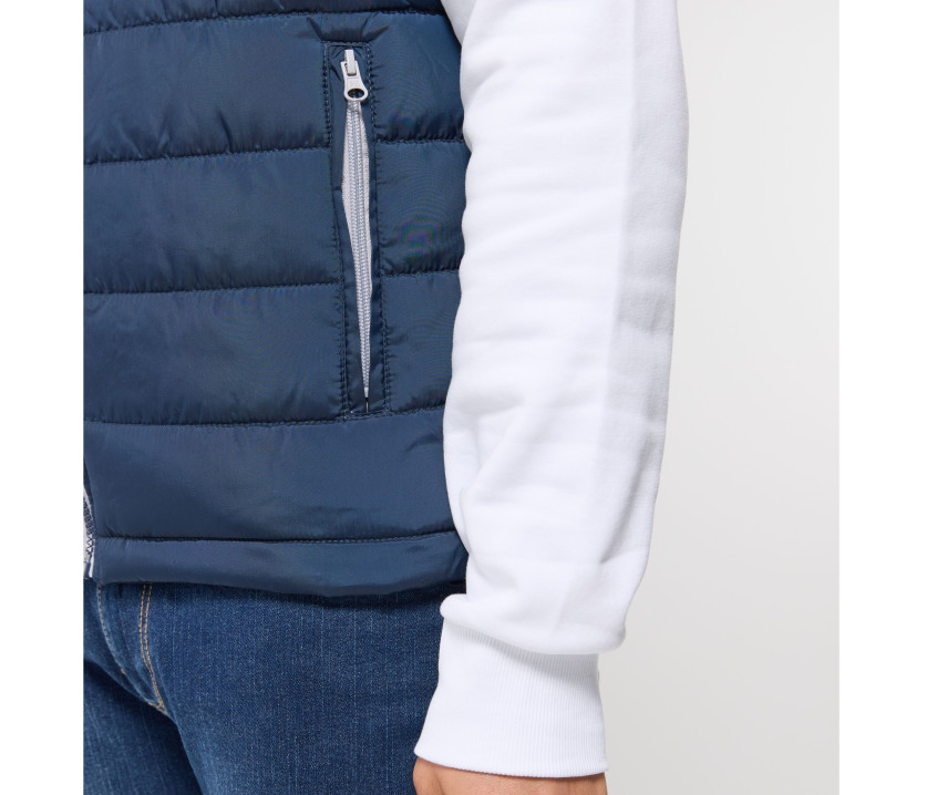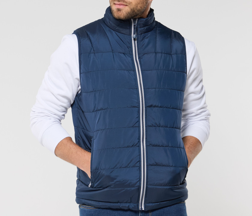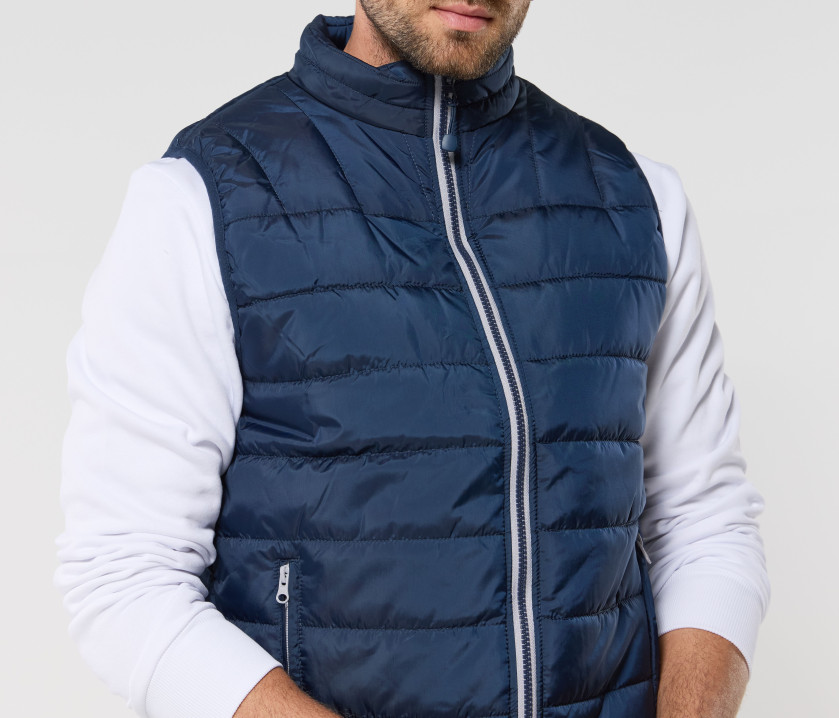 Bodywarmer tendance homme - Grand zip avec une poche intérieure gauche pour marquage. Possibilité de ranger totalement le bodywarmer dans la poche intérieure droite avec fermeture Velcro®. 2 poches latérales zippées avec rabat.