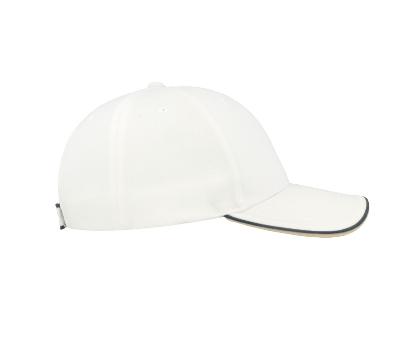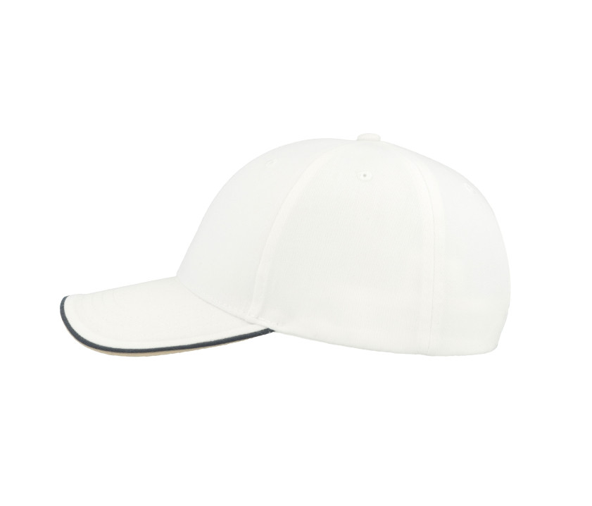 6 panneaux. Fermeture par Velcro®. Passepoil sur la visière et sur la patte de réglage. Visière contrastée et préformée. Œillets surpiqués. 4 coutures sur la visière. Tour de tête : 58cm. Structure de la visière en plastique.