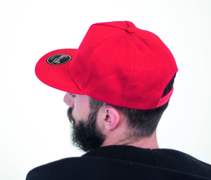 5 panneaux. Visière plate. Panneau avant renforcé. Sticker sur la visière. 6 coutures sur la visière. Oeillets surpiqués. Bandeau: 35% coton/65% polyester. Fermeture en pvc. Tour de tête : 58cm. Structure de la visière en plastique.