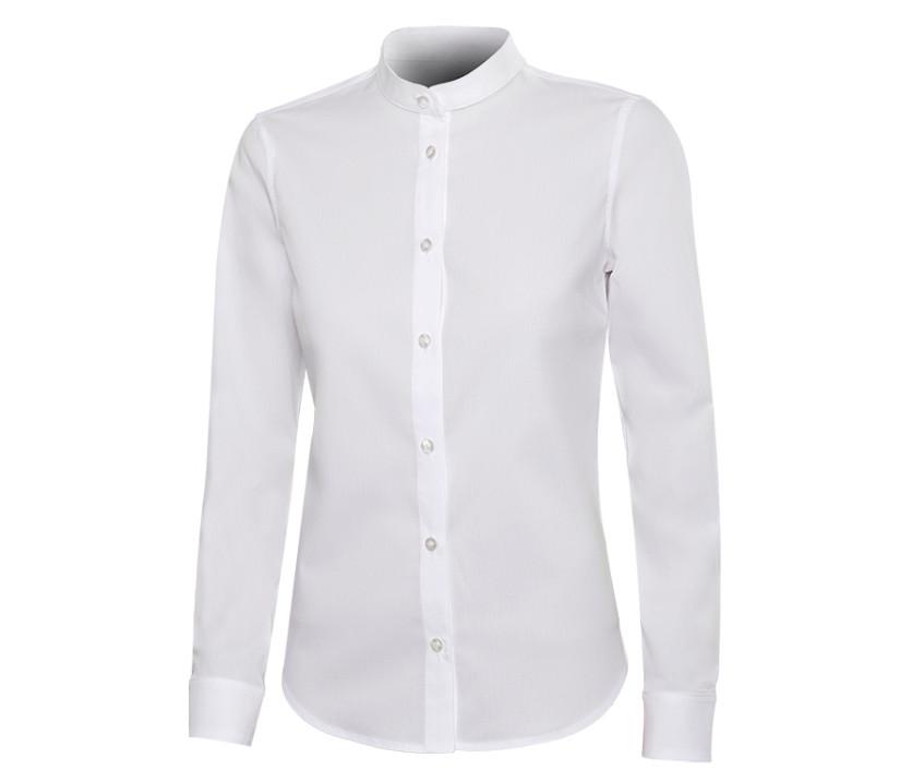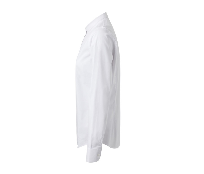 Fermeture boutonnée avec rabat. Col mao. Pinces avant et arrière pour une coupe cintrée. Empiècement dans le dos. Poignets boutonné. Bouton de rechange.