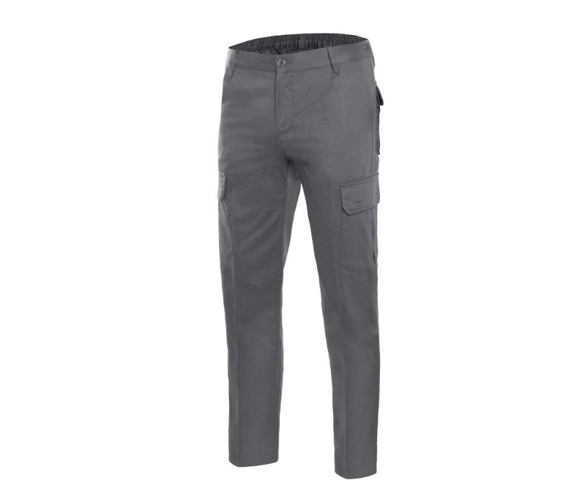 Fermeture centrale à glissière et bouton. Taille élastiquée. Double couture de sécurité. Pinces sur le devant. Six poches : 2 poches latérales. 2 poches de renfort avec fermeture centrale, rabat et Velcro®. 2 poches arrière avec fermeture à rabat et Velcro®.
