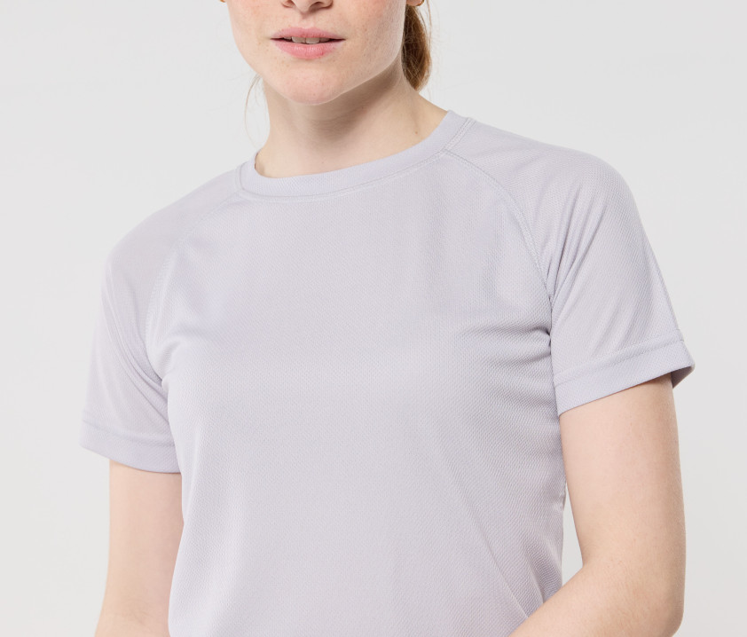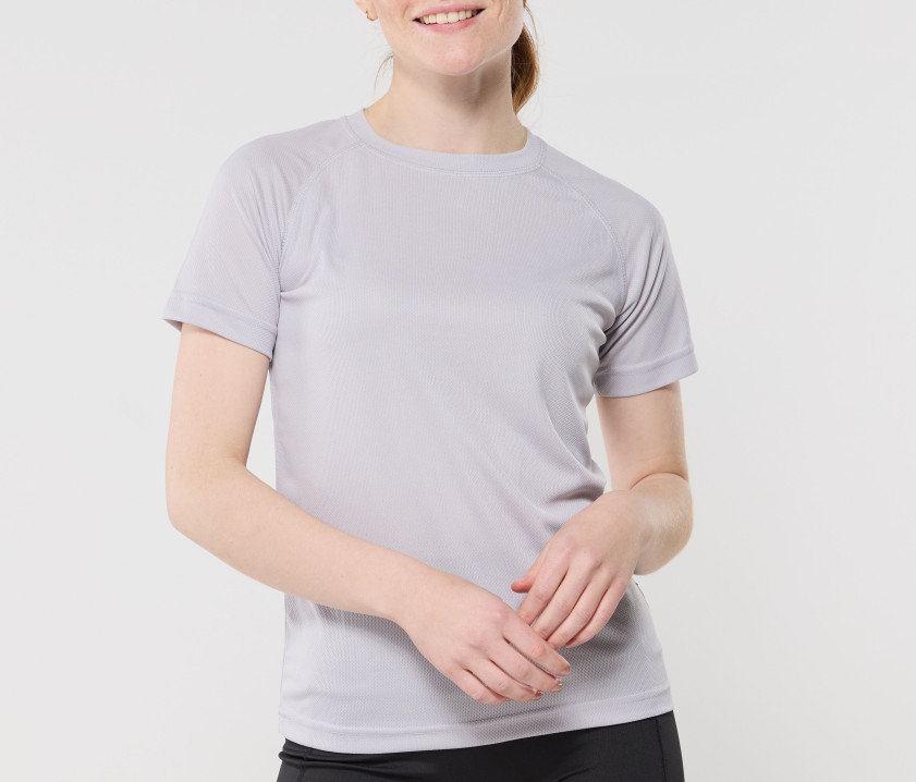 Tee-shirt femme en 100% polyester à séchage rapide. Coupe ajustée. Léger et respirant, tee-shirt adapté pour le sport. Manches raglan. Pas d'étiquette au col pour plus de confort.